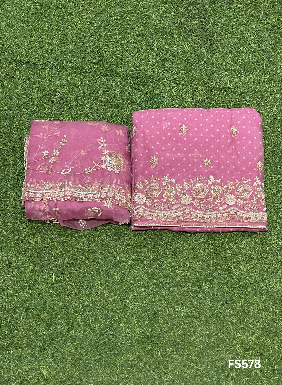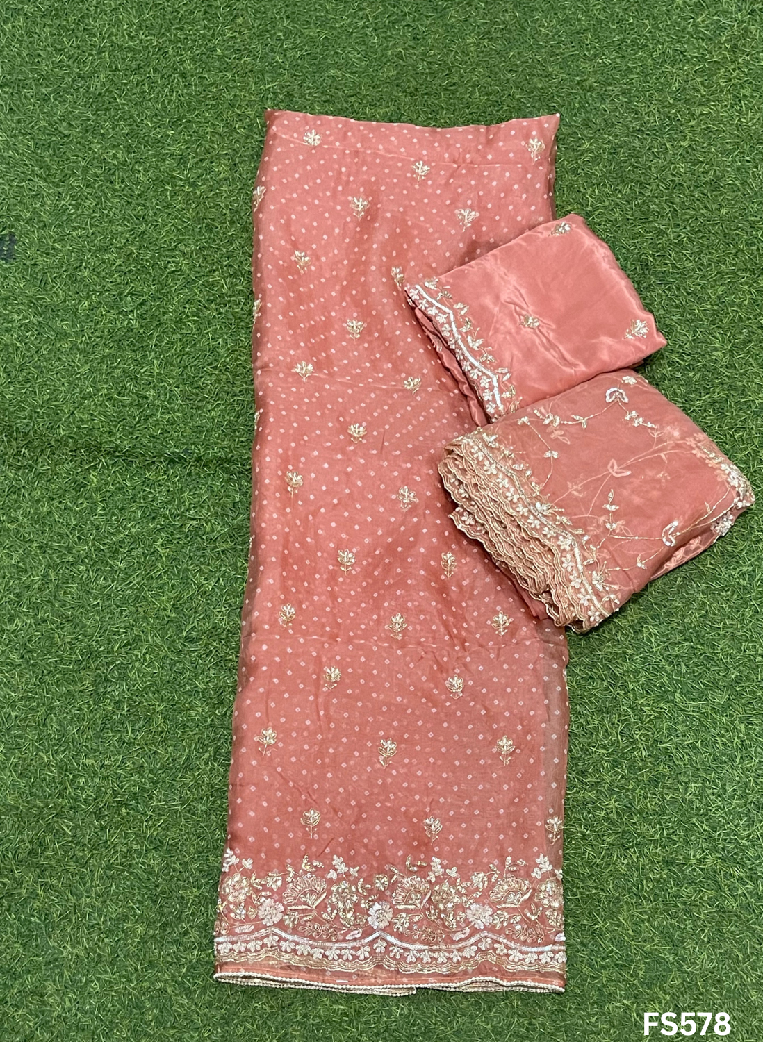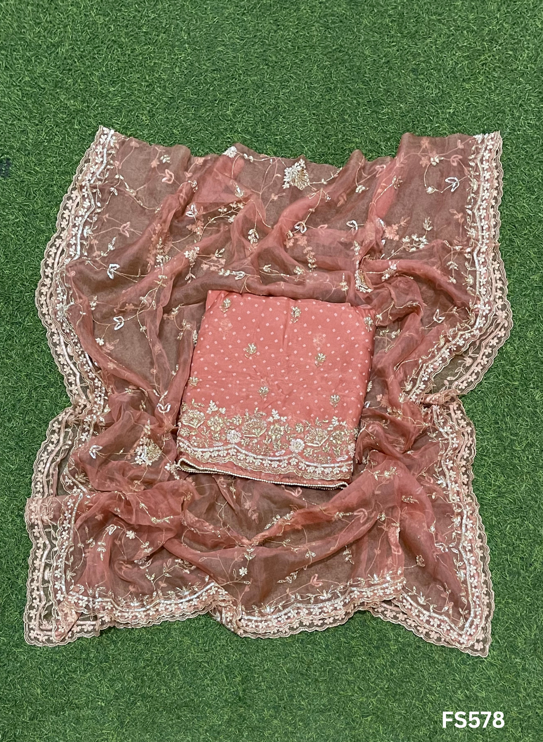 FS578 | Bandani print Organza Suit | Party Wear | Wedding | Jaggo | Ring Ceremony | Festival